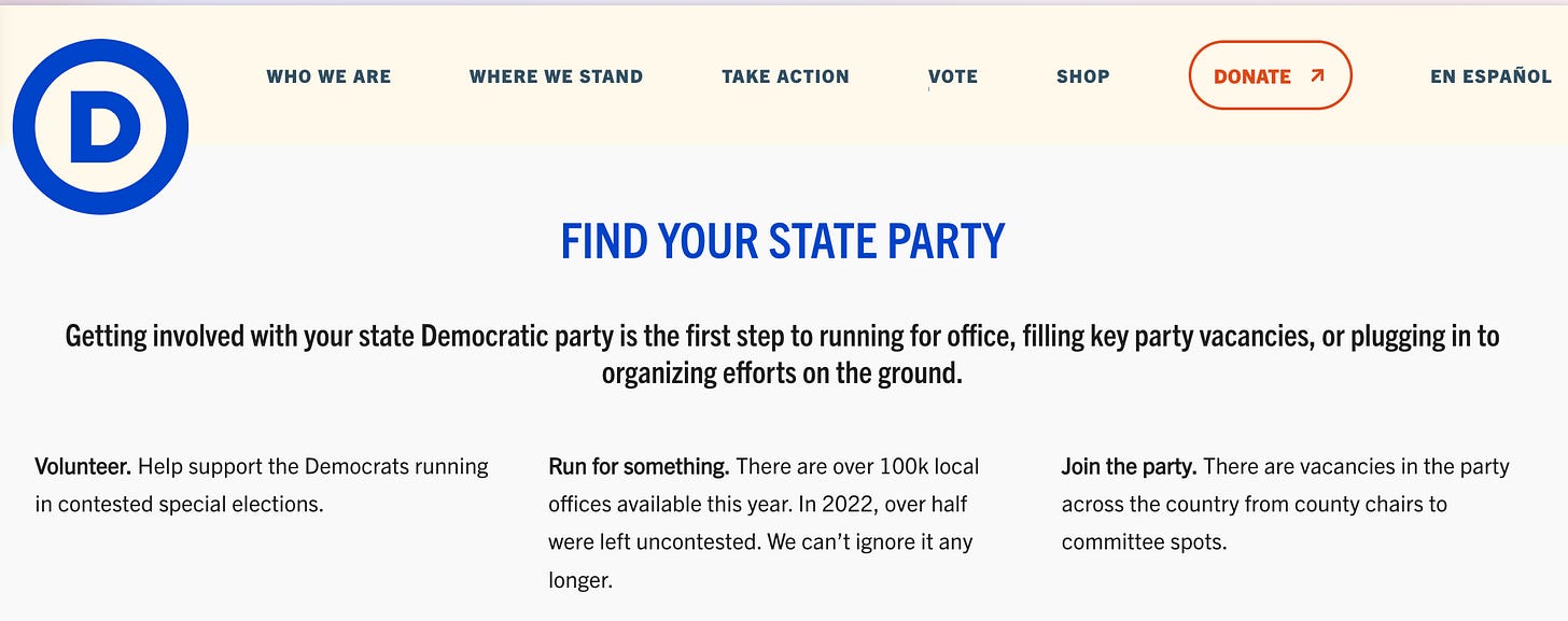 So here’s my ask: if you believe in democracy, don’t just donate to the presidential campaign or share the viral clip. Adopt your state party.